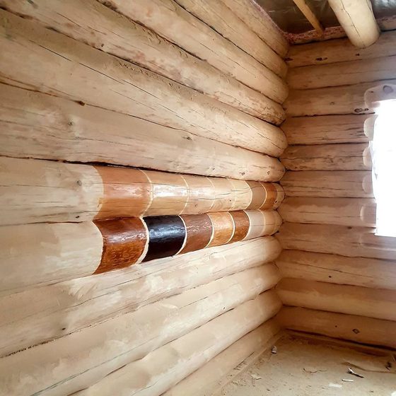 В зимний период для отделки сруба, мы прогреваем помещение до температуры +20С и поддерживаем ее с помощью обогревателей. При этом мы не нарушаем технологии защиты сруба ЛКМ и монтажа герметика.